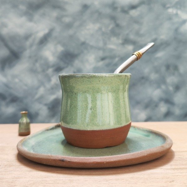 Mate de gres tostado con esmalte verde claro